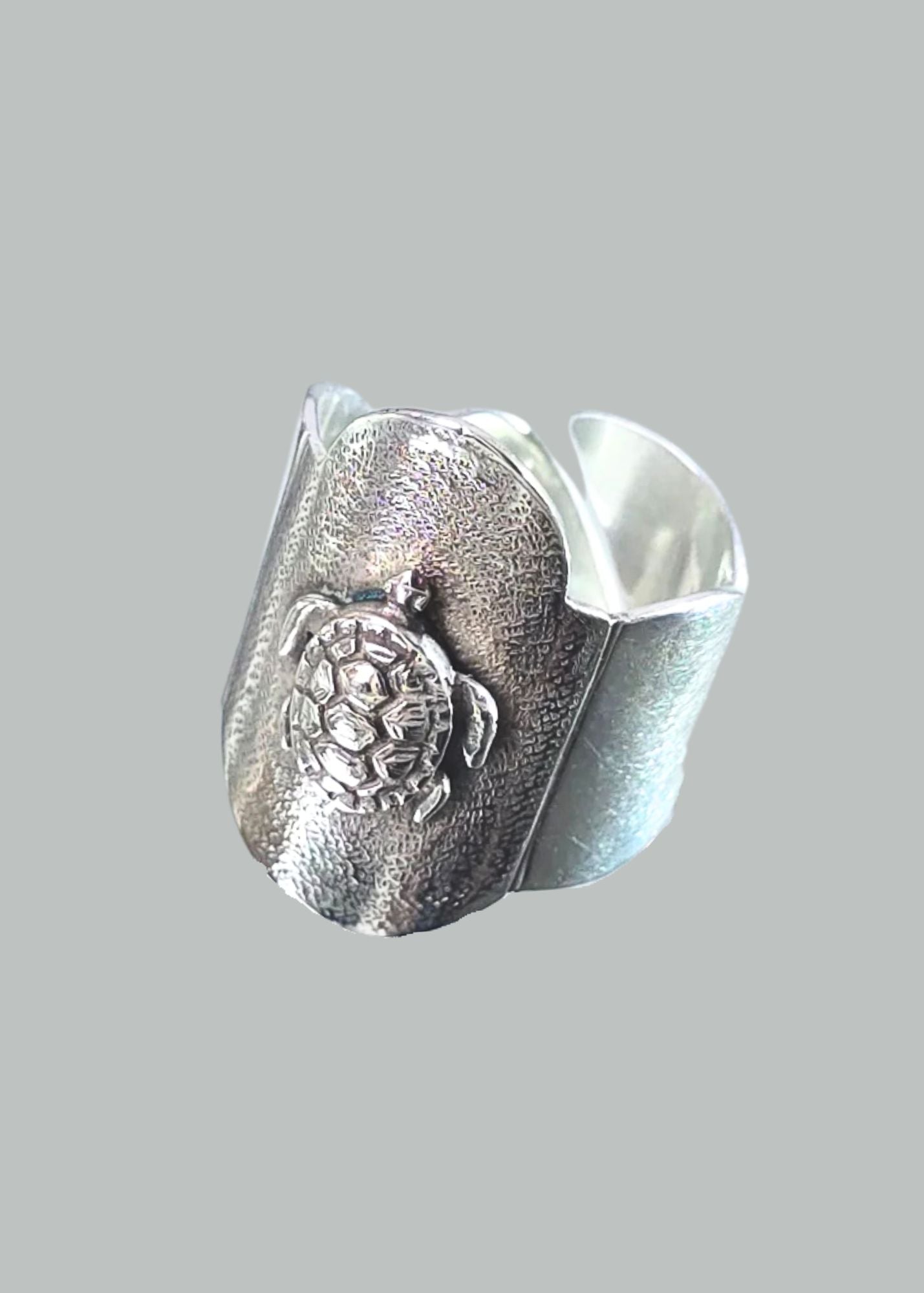 The wide band with a bold, raised turtle motif at the center makes it a striking statement piece that also flows well into your everyday.